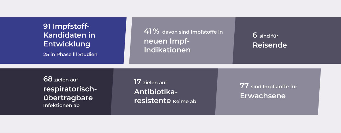 Die meisten davon sind Impfungen für Erwachsene, viele sind Weiterentwicklungen bestehender Impfstoffe, ein guter Teil fokussiert aber auch auf Krankheiten, gegen die es noch keine Impfstoffe gibt. Ein wichtiges Forschungsgebiet sind außerdem Impfstoffe, die dazu beitragen, Antibiotikaresistenzen zu reduzieren oder auch Krebserkrankungen verhindern können.